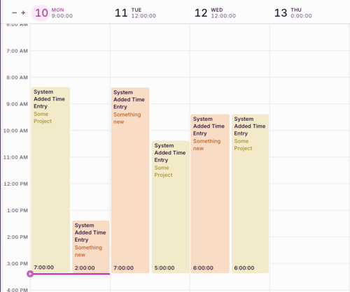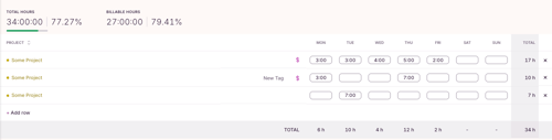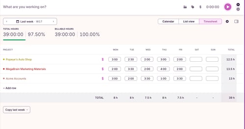 Unlike the Calendar or List view, the Timesheet view sorts and summarises all your weekly time entries by row in a simpler manner.