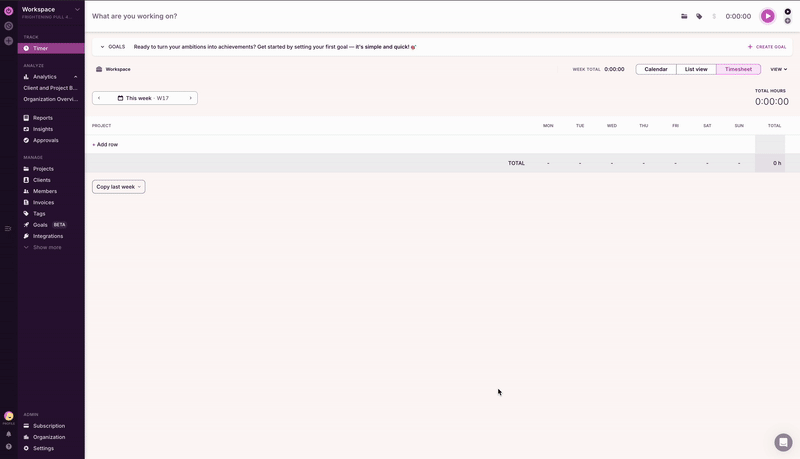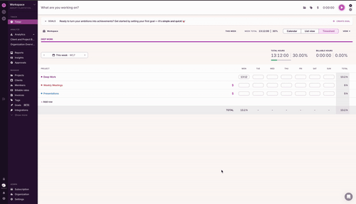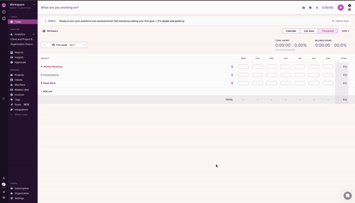 Add your weekly work hours to easily monitor your progress throughout the week. This feature allows you to compare your logged time against your target hours. Simply click on Add your work hours and enter your work hours to get started.