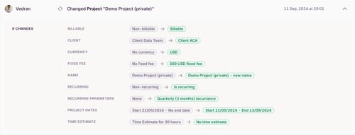 The time entries log is limited to time entries created or modified by someone other than the entry owner. For example, when an admin corrects a team member's time entry. To reveal more information about changes to a specific entry click on the down arrow located on the right side.