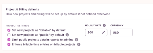 Some Project and Billing default settings are found under Settings > General, including whether billable projects enforce billable time entries, new project billable status and the default workspace hourly rate and currency.