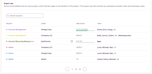 See a searchable list of all your Projects, and click on one to go to the Projects Team page where you can edit the Project Member billable and cost rates (Premium plans only). Click Edit Project button to change the Project's billable rate.
