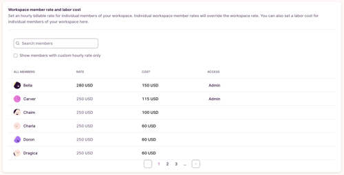 Additionally, you can also see all Workspace Members, and adjust their billable rate and cost rate (Premium plans only) in the same area. This section is searchable, and also allows you to filter our workspace members who do not have custom hourly rates defined for them.
