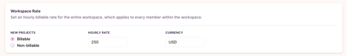 The overall Workspace Billable Rate and currency can also be set on your Workspace Settings page.