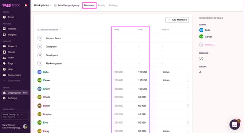 Workspace user rates can also be specified from the Organization > Workspace > Select Workspace > Members page. Add the billable rate and labor cost in the columns for them by clicking the field to edit it.