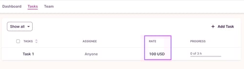 A billable rate per Task can be added via the Projects > Task tab on any billable project. Task level billable rate is the most granular billable rate available in Toggl Track. To edit the task-level billable rate, hover over the rate and click “Change billable rate.”
