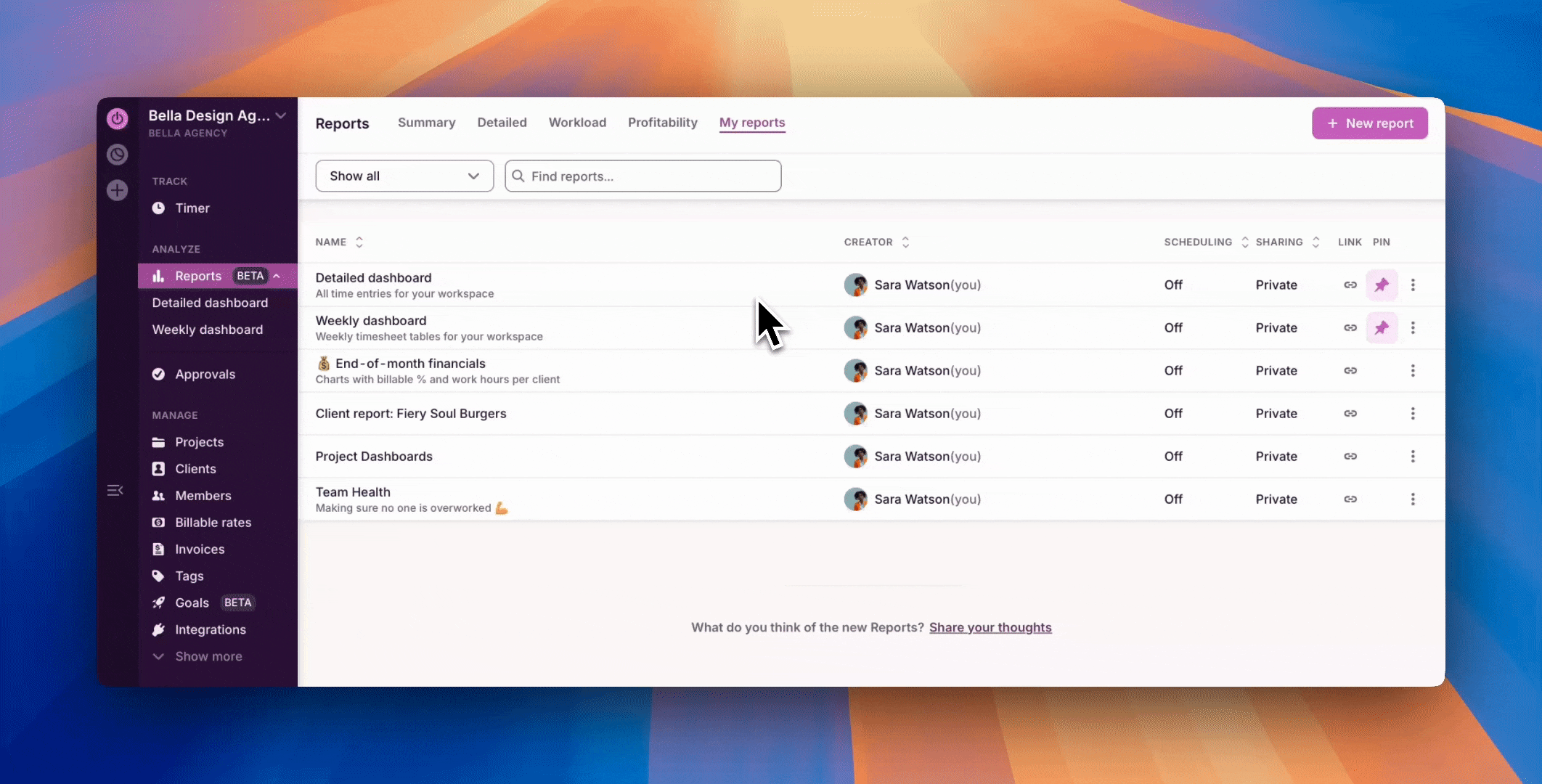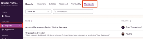 In the list of “My Reports”, you will find regular reports that you saved and shared, as well as custom reports built from scratch by you or your team. You can filter this table to show all report, or only those created by you or by your team.