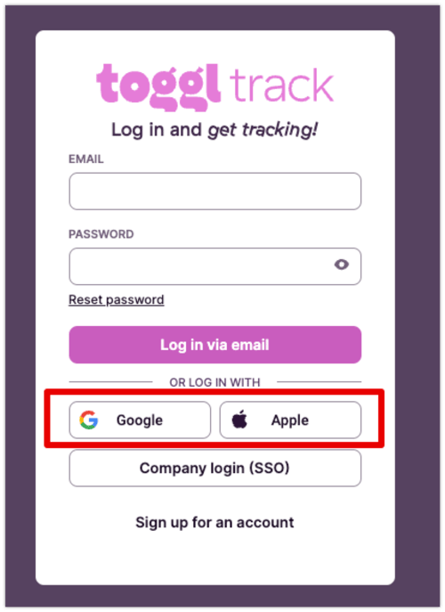 You can log in to Toggl using the Google or Apple buttons on the login page: