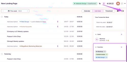 Set up your favorite time entries and quickly start them with one click on the Timer page on the webapp.