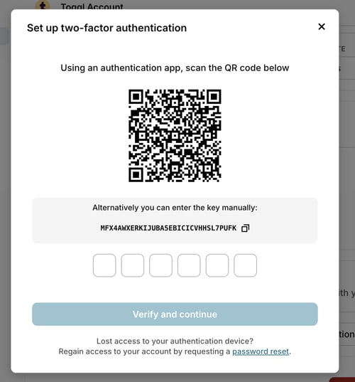 Setting up two-factor authentication (2FA)How to add an extra layer of security to your Toggl Track account, plus what to do if you ever lose access to your authenticator.