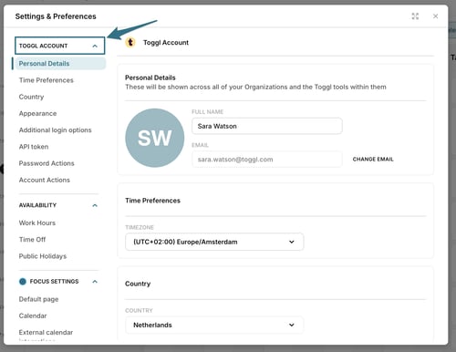 Open Settings & Preferences from the sidebar or your profile menu. The popup is divided into three sections in the left-hand navigation: Toggl Account, Availability, and Focus Settings.