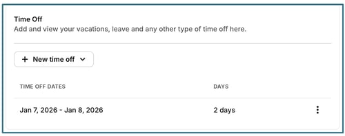 Click New time off to add an entry and select start and end dates.