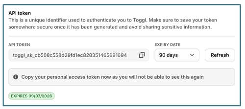 Your API token is a unique identifier used to authenticate you to Toggl via the API. Keep it private — sharing it gives others access to your account data. The token is masked by default, and the Expiry date field shows how long it is valid (e.g. 90 days). Click Generate to create a new token. Generating a new token immediately invalidates the previous one.