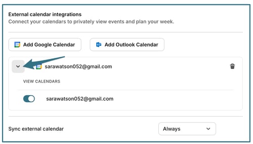 Connect external calendars to privately view your events alongside your planned work. Events are visible only to you. Click Add Google Calendar or Add Outlook Calendar and complete the sign-in flow to connect a calendar. Once connected, the account email appears in the list. Click the trash icon to remove a calendar at any time.