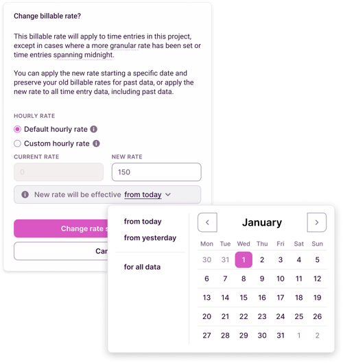 When changing a billable rate, you will see a popup asking whether the rate should be changed for today, a specific past or future date, or all data.