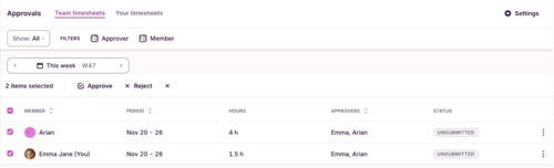 To perform Bulk actions, select the desired Members by clicking the checkbox on the left and the option to Approve or Reject the Timesheets will appear.