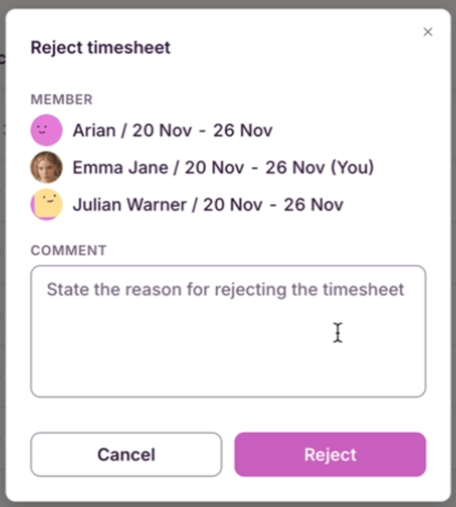Similar to single Timesheet Rejections, if you decide to perform a bulk rejection, you will be asked to input the reason for rejecting the Timesheet.