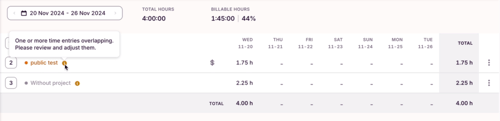 To see all the time entries that are overlapping in each group, press the number to the left of the Project the Time Entries belong to. (In the screenshot above, this is indicated with “2”). You will then be able to decide if the timesheet should be approved or rejected.