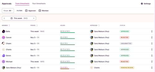 While specific Approvers can be set based on your needs, all workspace admins can review Timesheets and approve or reject them. Hovering over a status indicator for a timesheet will show you which Admin last reviewed it. Approvers will also receive email notifications when a timesheet they need to approve has been submitted.