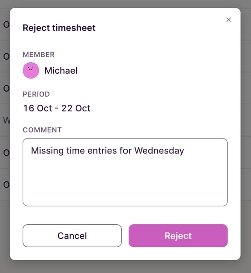 When you reject a Timesheet, you will be asked to provide a reason to give the user more context on what they can do to fix the issue. The user will be sent an email notification and can update and re-submit the Timesheet again. However, you can still Approve it without any further changes being necessary if it was Rejected by mistake.