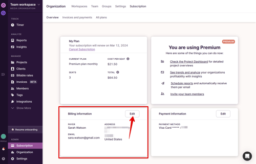 Find ‘Billing information’ on the bottom left and click ‘Edit’.