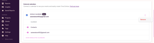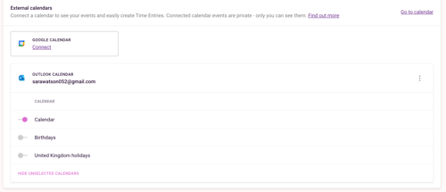 You can choose the calendars you wish to integrate with Toggl Track, hide un-selected calendars to avoid cluttering the view or remove the integration entirely from the My Profile page.