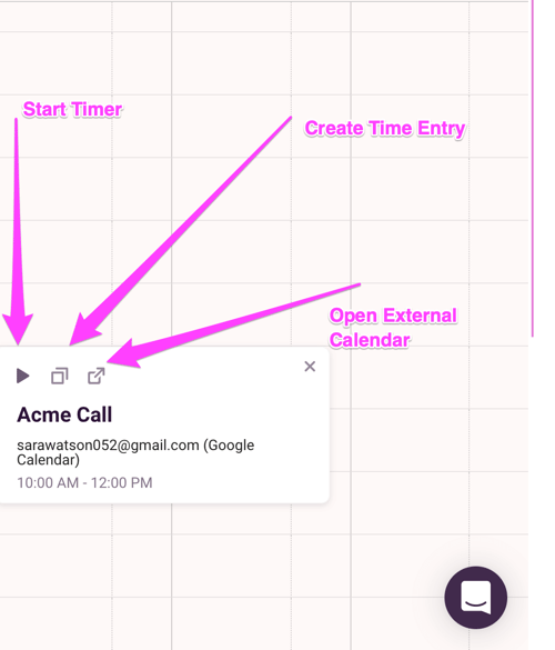 Click on any calendar event to start a time entry, copy it over as a time entry, or open the calendar event page. You can also see which calendar it belongs to here.