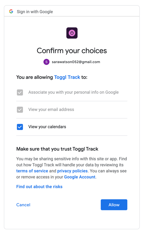 These permissions will differ based on whether the email address for your Track account matches your Google account. Please read these carefully for each calendar you integrate.