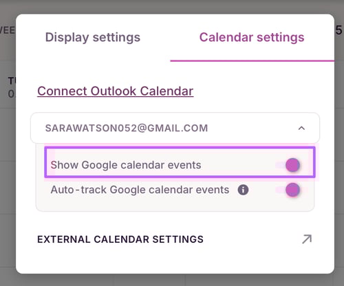 After the setup is complete, you can view your calendar events on the Calendar view. To show/hide Google events from showing on your calendar view, click on the Settings cog and toggle between show/hide (this is a Starter plan feature).