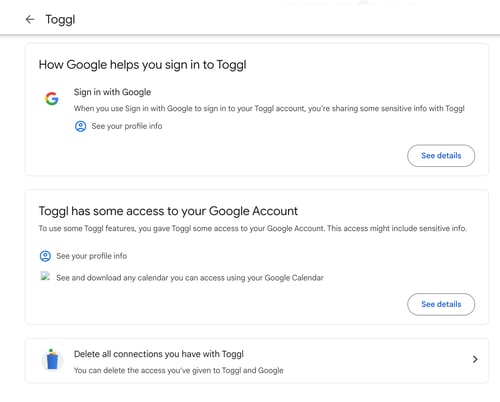 A simple way to resolve this issue is to remove Toggl from your third-party apps and services in Google and re-authenticate your calendar integration.