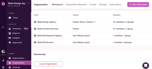 View multiple workspaces under one Organization (available for Enterprise pricing only) and manage Members, Activity, and Workspace Settings.