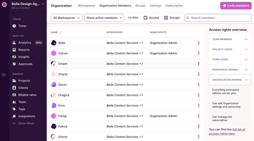 The Organization Members tab shows all user groups and users in the chosen Organization, plus their Billable Rate (paid plans only), Labor Cost (Premium plan only), Access-level at the Workspace level when viewing a single Workspace.