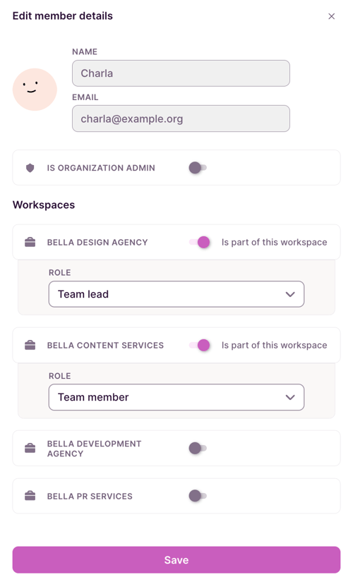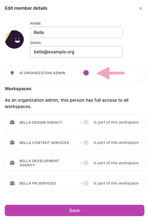 This is the Edit member details window, where you can grant the different access levels, granting the Organization Admin level on a user will automatically add the user to all Workspaces under said organization with Organization admin privileges.