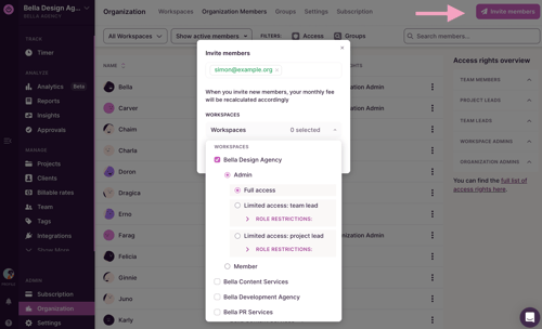 Click the Invite Members button to invite users to one or more Workspaces under this Organization. While inviting someone, you can also choose whether they will be a regular user or Admin on the chosen workspaces as shown in the screenshot below:
