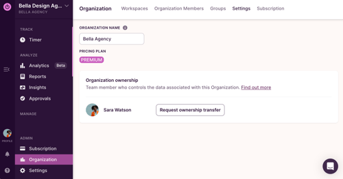Manage Organization settings like its Name, Pricing, and Ownership.
