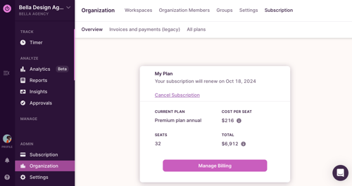 The Subscription Overview tab shows you the current plan you are on, your active user count, and any discounts available. You can also add or edit payment details and billing information from this page by clicking on "Manage billing"