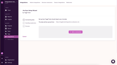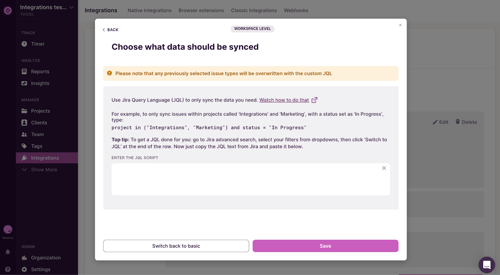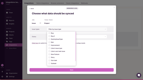 Suppose you get an error while enabling the integration. In that case, you may be trying to import more than 10,000 records from Jira into your Track workspace. In that case, it's best to delete the integration and create a new issue type in Jira, where you can assign issues with tags specifically for importing into Track and enable the integration again.