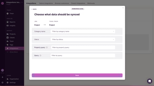 You can map Toggl Track entities ( Project, Task, Tag, Client) with Jira entities (Project, Issue, Label), and filter by Project Category, use queries or JQL, Status or Issue Type (Epic, Story, Task, Subtask, Bug, etc.), just how you’ve set them up.