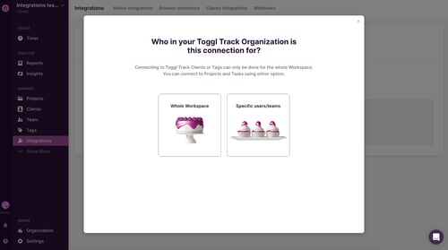 To start syncing Jira entities into Toggl Track, you must first choose to set the integration up for the whole workspace or only some users/a user group.