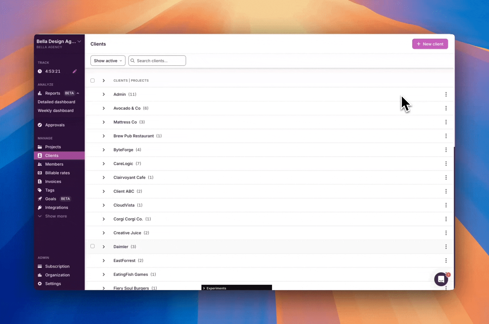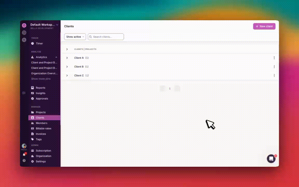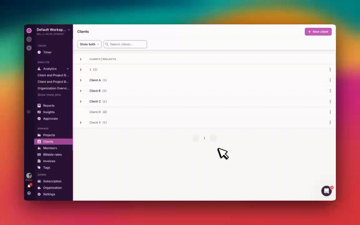 Type the name of your new client in the "Client name..." box and click the pink "Create" button. You can also assign existing projects, or create new projects for this client from here.