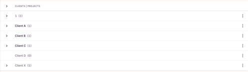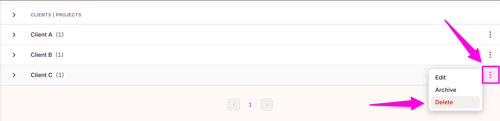 To delete clients, go to the "Clients" page using the left-side menu via the Toggl Track web app and click on the three dots next to the client you'd like to remove: