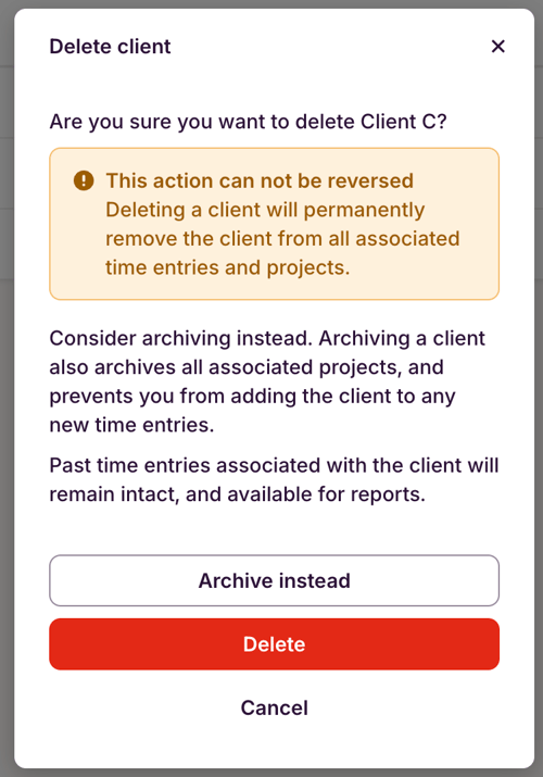 Once you confirm that you'd like to delete a Client, there is no way to undo the action, and the client will be removed from all Projects it was allocated to.
