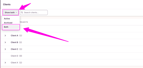 You can view all Clients (Archived and Active) on the Clients page by choosing "Both" from the filter at the top, or choose to view just Active or Archived.