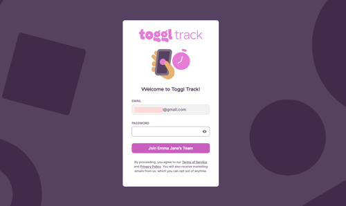 Click on the invitation link within the invitation email. Doing so will open Toggl Track and ask you to create a password and accept our TOS: