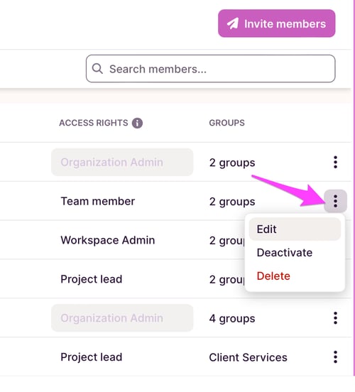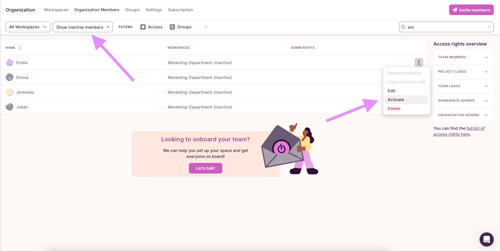 Organization users can be added and removed from the Members page. You can review active, inactive and invited users here, filter for users or search through them, view what workspace(s) they are a part of, change access rights and edit or deactivate them.