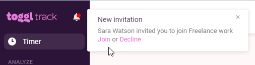 Invitees who already have a Toggl Track account must accept the invitation through the web app. More specifically, via the notification centre. Click on the small bell icon in the bottom-left on the webapp to view all notifications.