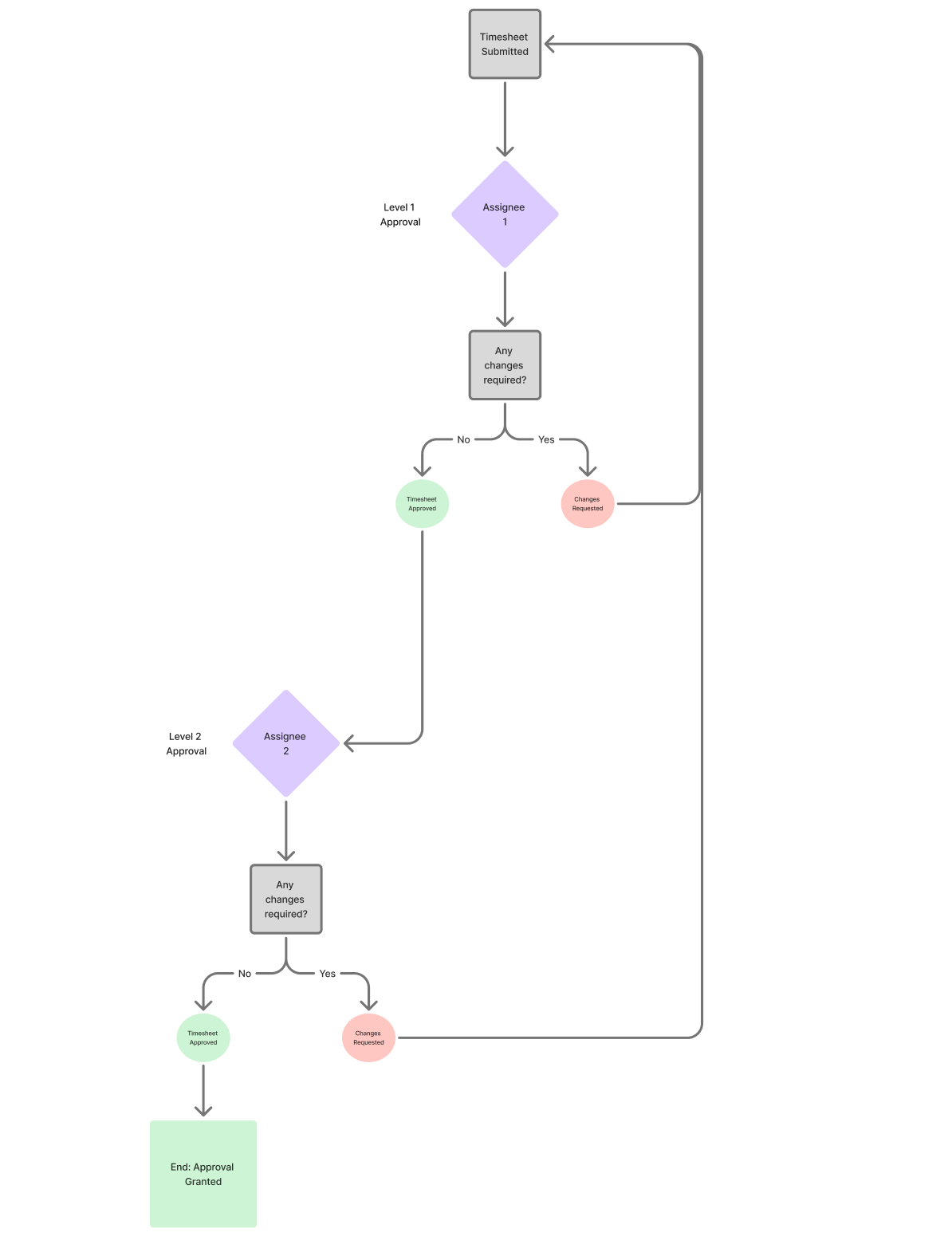 After the requested changes have been addressed, and the submitter resubmits the timesheet, the whole approval flow begins again and all subsequent approvers on the first layer will receive a new notification and the same thing happens on layer 2.