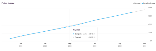 Trendline (gray): shows a prediction of hours tracked in the future based on historical time tracking data for the project you are viewing