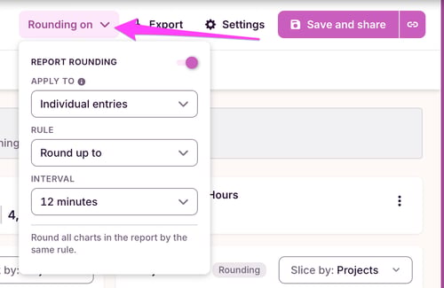 Time entries can be rounded up or down based on your chosen settings. You can enable Rounding on all our reports by clicking on the Rounding button next to the export button in the top right corner.