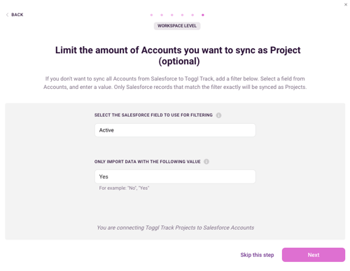 Once you set up how new Projects should be named, you'll have the optional step of filtering which Salesforce objects are synced. If you want to sync ALL of your chosen Salesforce objects, skip this step. If you only want to sync SOME of the Salesforce objects, simply pick the field you want to filter by, and the value that the filter should match. (This value is case sensitive, and matches exactly, so be careful here!) In this example, we'll only sync Salesforce Accounts where the Active field is set to Yes.
