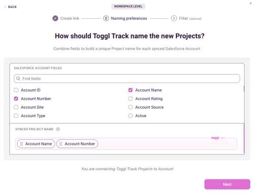 1. Say you’d like to create projects in Toggl Track using the name and account number fields from Salesforce Account records, but you’d like them to be separated by an underscore rather than a space.